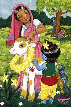 Гопал украсил телят, затем Он Сам возглавил проведение ритуала. Он дал задания всем мальчикам и девочкам. Они выполняли их старательно, чтобы удовлетворить своего любимого друга.