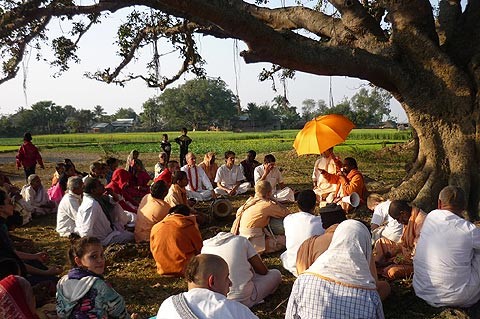 Хари-катха в исполнении Шрилы Ачарьи Махараджа под сенью ближайшего баньянового дерева.