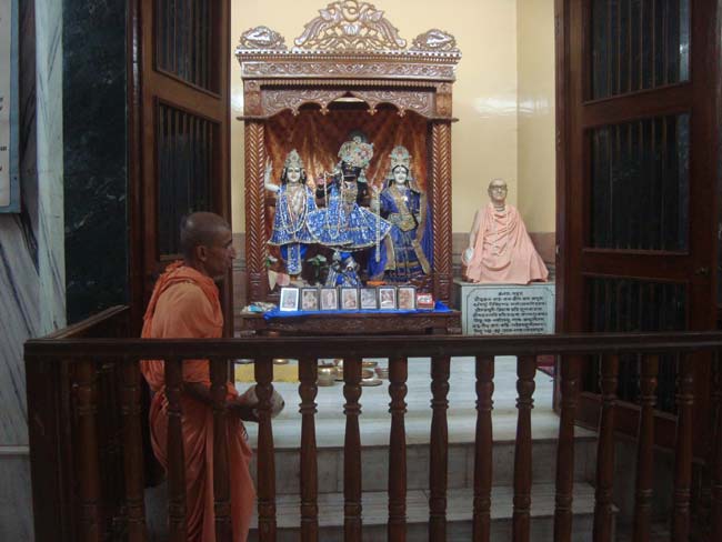 Возвращение в наш Шри Чайтанья Сарасват Матх и миссию и участие в вечернем арати Шри Шри Гуру- Гауранги Гандхарвы-Расабихариджиу. Наш храм расположен в самом центре Сева-кунджи и Вриндавана, примыкая к Шри Шри Радха-Дамодар-мандиру Шрилы Дживы Госвами Прабху, его самадхи и самадхи